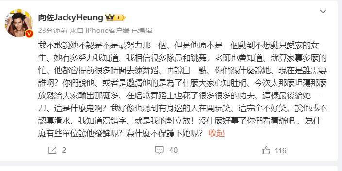 搜狐娱乐讯 7月3日,向佐为老婆郭碧婷在节目中遭Miss的背刺发声,他写道:“你们凭什么说她,现在是谁需要谁啊?”并表示自己的妻子郭碧婷非常努力,会提前准备舞蹈,所有人都能看到她的决心,此外,他还写到:“这样最后给她一刀、这是什么鬼啊?”并指出用这件事开玩笑非常不礼貌。