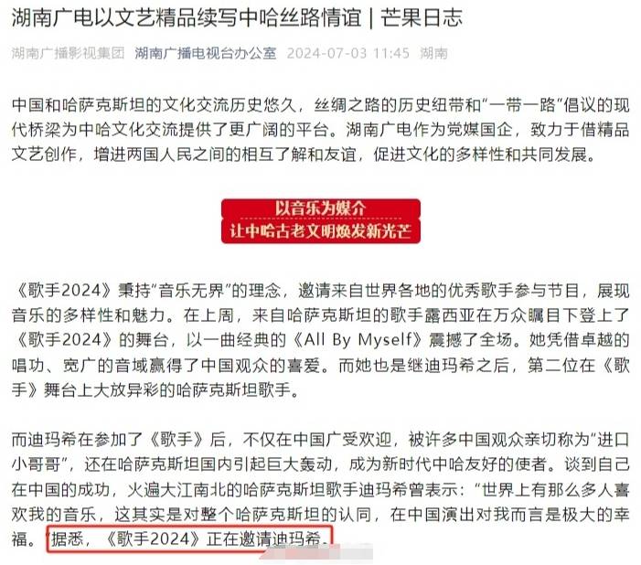 搜狐娱乐讯 3日,湖南广播电视台办公室官方发文透露,《歌手2024》正在邀请哈萨克斯坦歌手迪玛希。