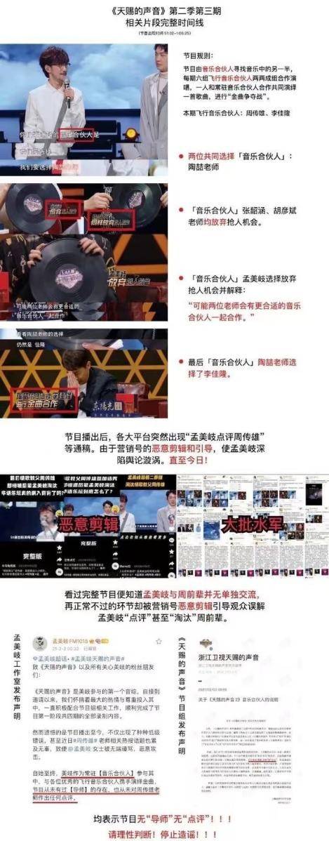 01当事人在社交账号表示真相应该被看见,《天赐的声音》是以歌会友的音乐节目,没有导师选手之分,如果看完整节目的话,就会发现,孟美岐和周是没有交流的。