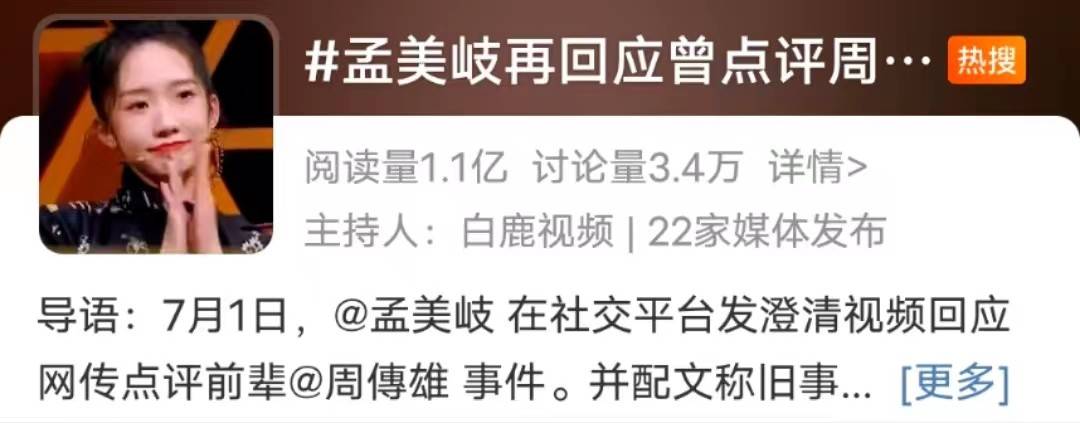 孟美岐点评周传雄的事件一度让她的事业遭受重创,也经历了网暴。今日,有关#孟美岐再回应曾点评周传雄的话题引起了大家的讨论。