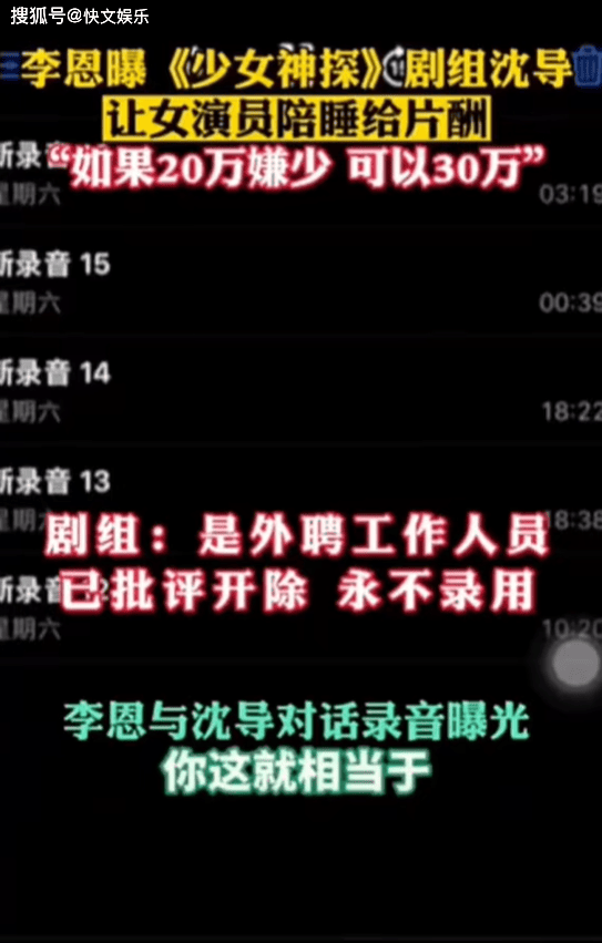 李恩也曝光了与所谓沈导的录音与通话,对方围绕20万还是30万陪睡展开了讨论。