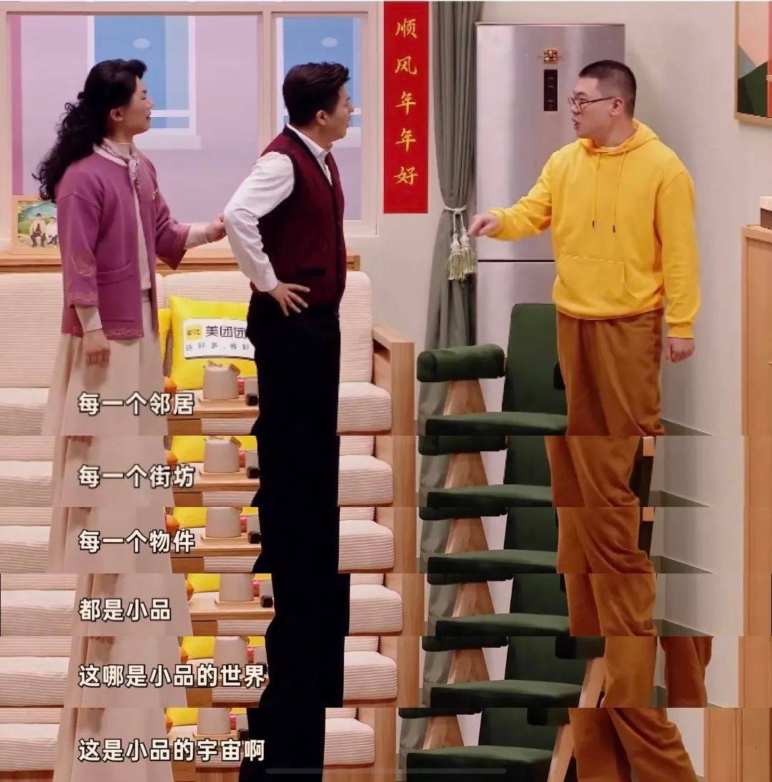 《小品的世界》几乎做到拉通全年龄笑点,以作品致敬《楚门的世界》、多位经典小品角色等展开并highlight世界是个巨大的小品的概念,把中国人看了一定会笑的梗都包进去了,“这不只是小品的世界,这简直是小品的宇宙啊”。演员通过夸张的表演和生动的语言,为观众带来欢笑和放松。