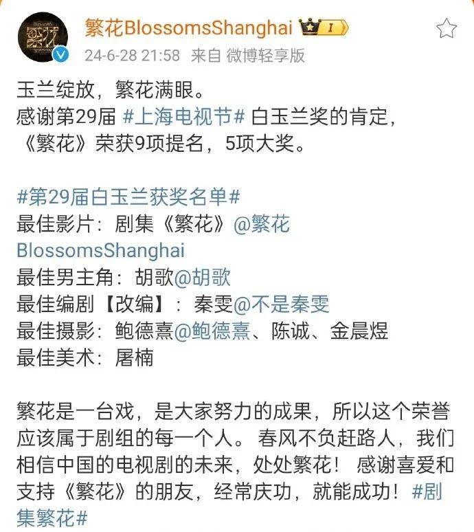 6月28日晚,第29届上海电视节白玉兰奖获奖名单揭晓,其中《繁花》9提5中,无疑是当晚的最大赢家。