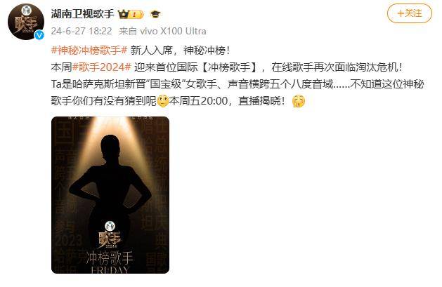6月27日,@湖南卫视歌手宣布:本周《歌手2024》 迎来首位国际冲榜歌手。此外,节目组还介绍称“Ta是哈萨克斯坦新晋‘国宝级’女歌手、声音横跨五个八度音域……”