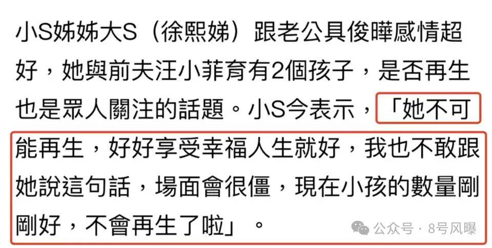 近日,据台媒报道,小S在出席活动时接受采访,被问及大S是否会再生孩子,小S表示“大S不可能再生,自己也不敢和大S聊这些”。