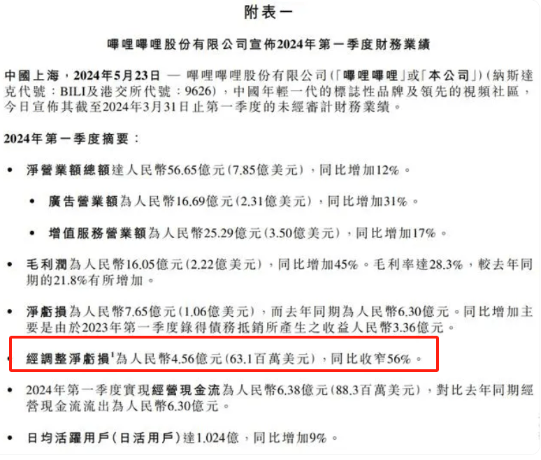 最近B站公布截至2024年3月31日的第一季度未经审计的财务报告。财报显示,1季度B站总营收同比增长12%,广告业务同比增长31%。但B站盈利能力仍旧不及预期,调整后的净亏损为4.56亿元。