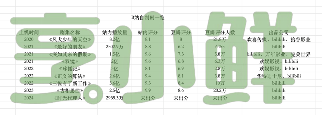 从2020年至今五年,B站共推出9部自制剧,走慢工出细活的路线。这九部分别为《风犬少年的天空》《最好的朋友》《突如其来的假期》《双镜》《珍馐记》《正义的算法》《三悦有了新工作》《古相思曲》以及前面提到的《时光代理人》。
