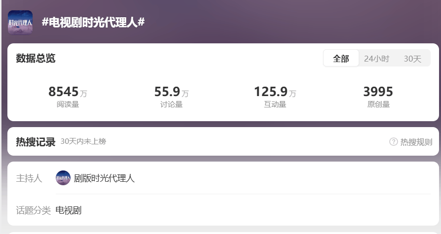 6月19日上线当天,猫眼专业版全网热度榜显示,《时光代理人》堪堪排在第六位,20日热度飙升进入前三,但还是被《玫瑰的故事》和《墨雨云间》压过一头。从21日至截稿,《时光代理人》的热度基本在猫眼全榜7-10位之间徘徊。