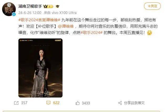 今天(26日),《歌手2024》官宣谭维维补位:九年前在这个舞台走过的每一步,都铭刻热爱,掷地有声!欢迎【补位歌手】@谭维维 ,期待你将对音乐的执着信仰,用那充满斗志的嗓音,化作“维维动听”的旋律,点燃歌手2024的舞台。本周五直播见!