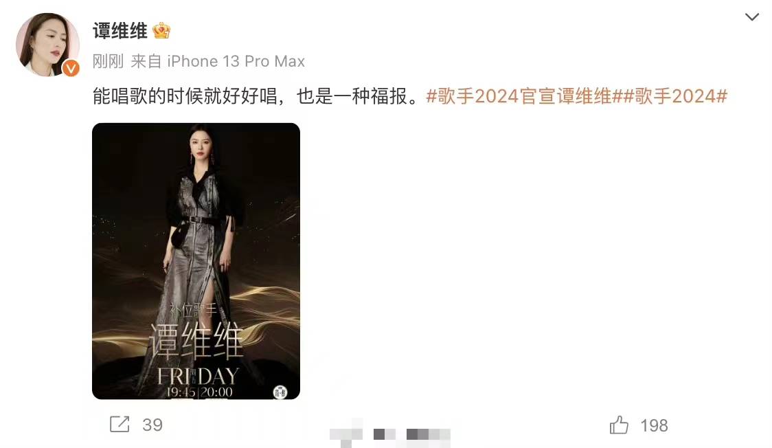搜狐娱乐讯 6月26日,《歌手》2024官宣谭维维参赛,谭维维回应补位表示:”能唱歌的时候好好唱,也是一种福报。“