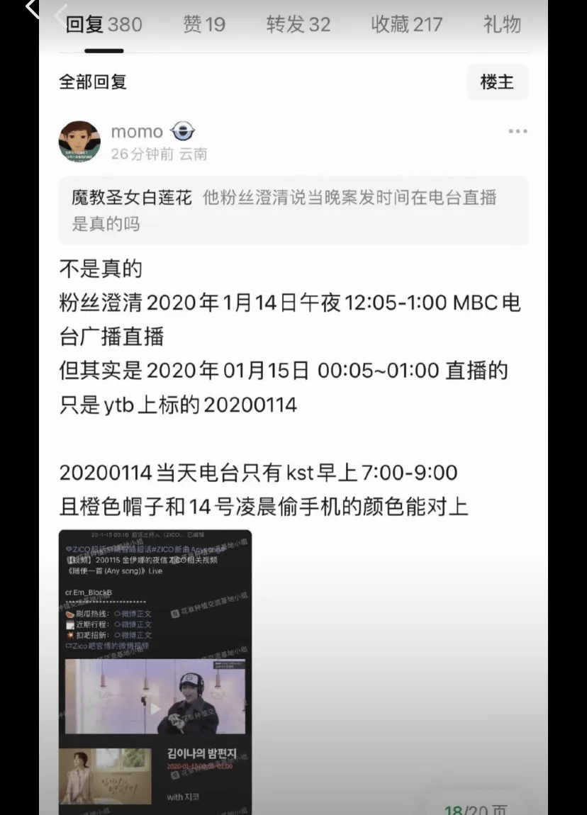 但也有人说,监控视频记录的时间是200114零点30分,而电台广播时间则是200115,200113晚上ZICO是没有行程的,那200114那天他到底去了哪?!