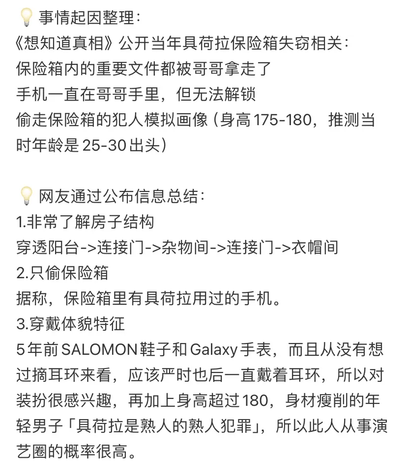 2019年11月具荷拉去世,一年后她家中的保险箱被窃。作案人是偷偷潜进她家,并十分熟络地输入密码拿走的,所以熟人作案的概率非常大。