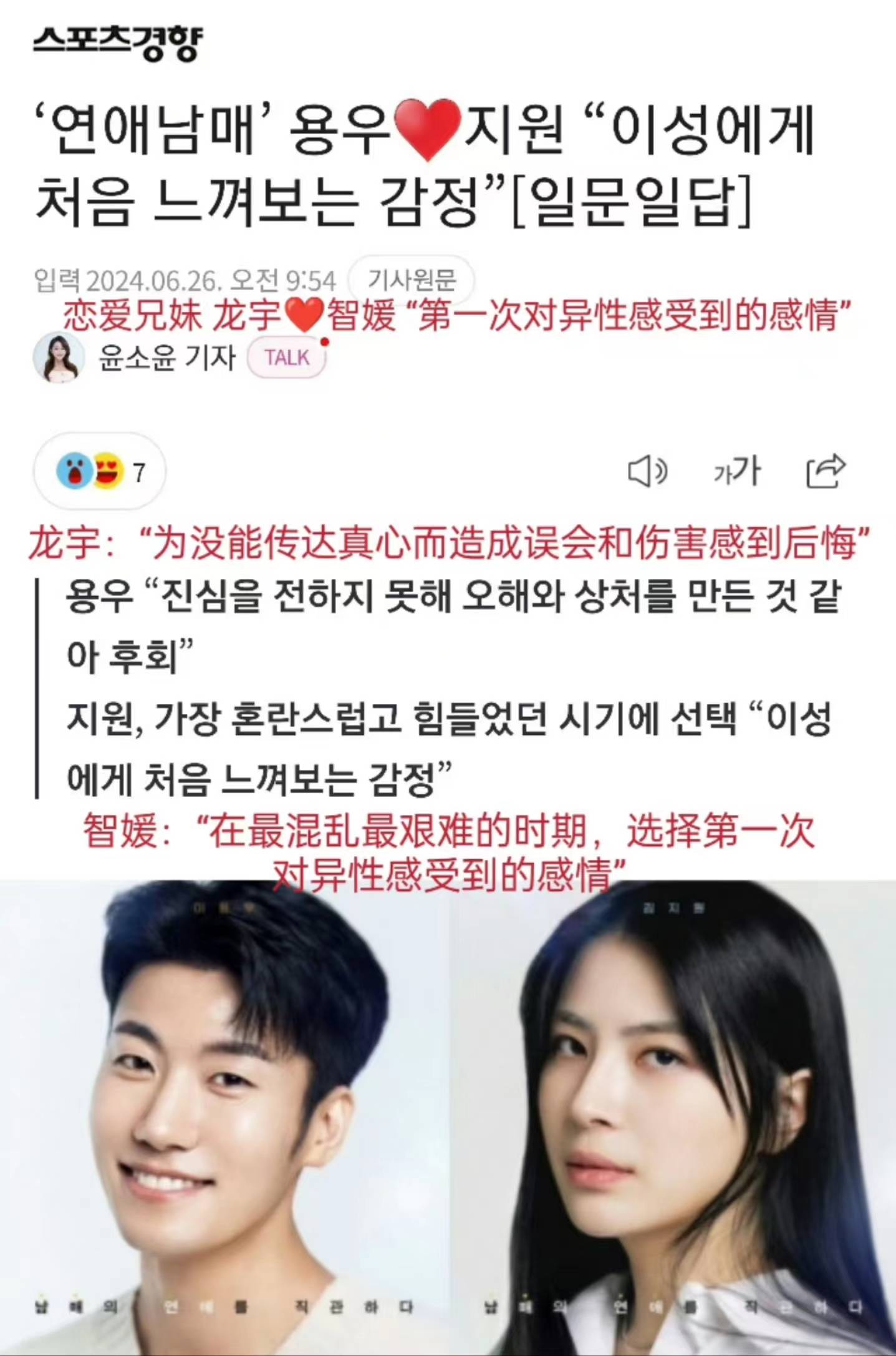 搜狐娱乐讯 6月26日,在《恋爱兄妹》终映采访中,李龙宇对一起出演节目的其他嘉宾表示了感谢和致歉。他表示自己拍摄时心情混乱,因为更想表现搞笑而不够真挚,对于给他人带来的误会感到后悔和道歉。