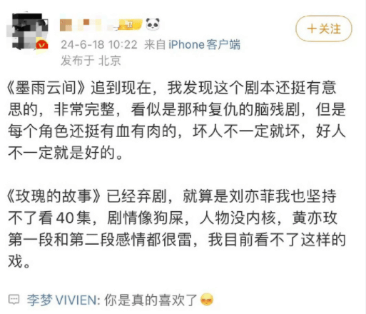 近日,有位网友发文大赞《墨雨云间》是好剧,而同时还吐槽了刘亦菲主演的《玫瑰的故事》剧情像狗屎,人物没内涵。