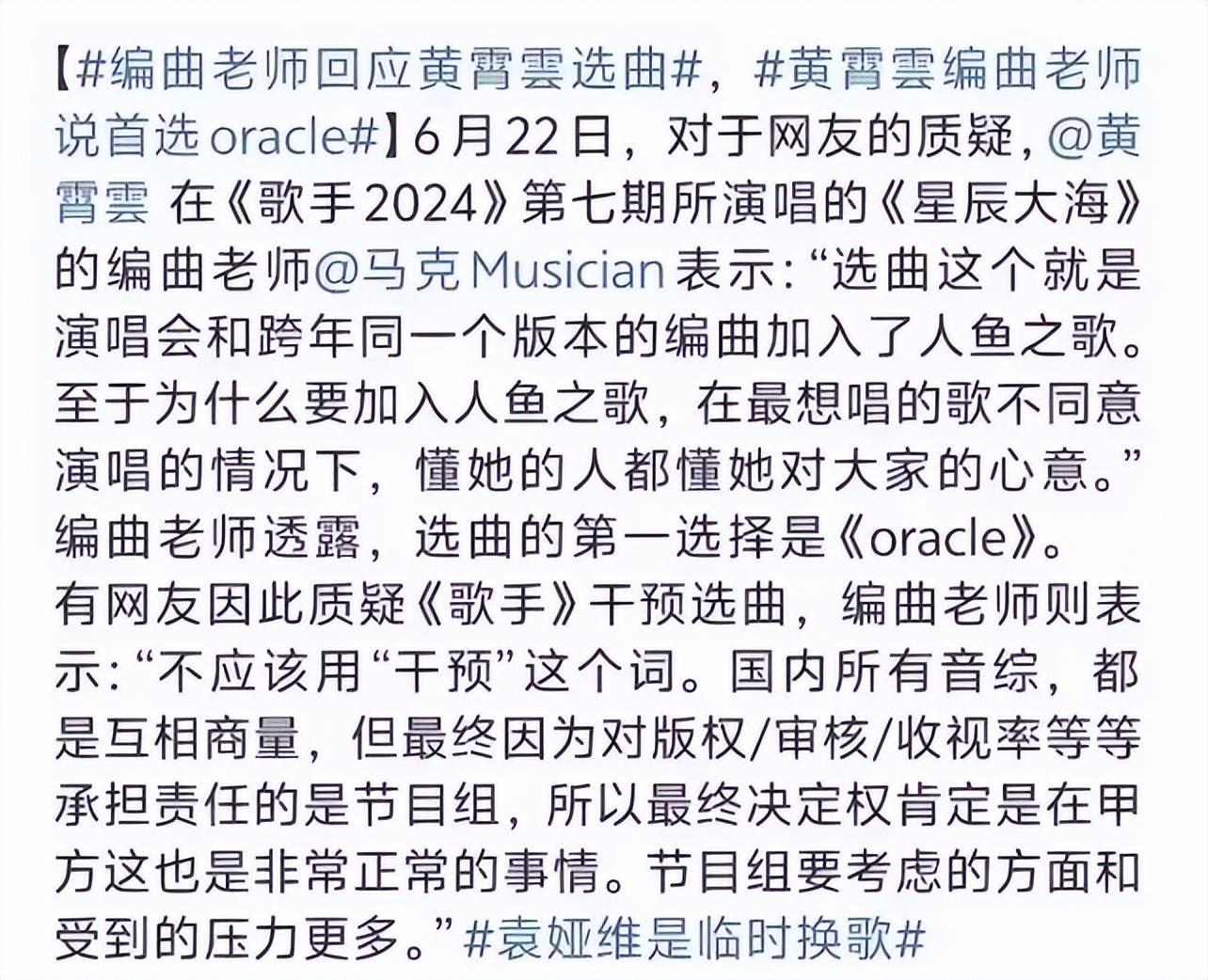黄霄云首选的歌曲不是《星辰大海》,而是《oracle》,不是节目组干预这件事,而是国内所有音综都是互相商量,但最终因为版权、审核、收视率等承担的是节目组,所以最终决定权肯定在甲方!