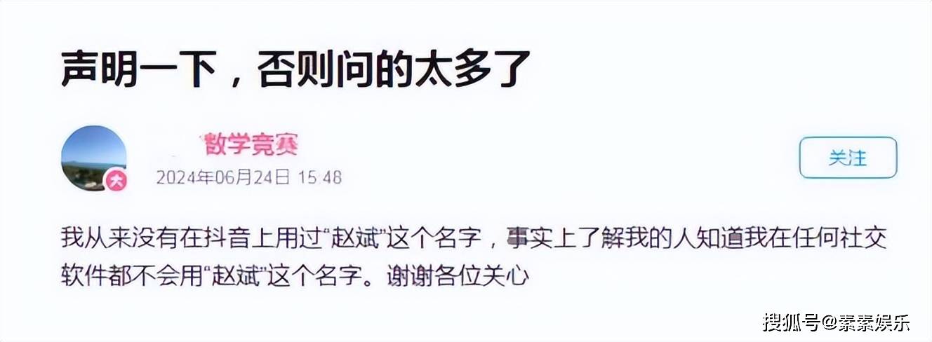 6月24日,赵硕士个人账号再一次发声,他强调自己并没有说过姜萍作弊的这一件事情,只是自己曾质疑该事件存在造假的可能性,怀疑此事件是一场作秀。