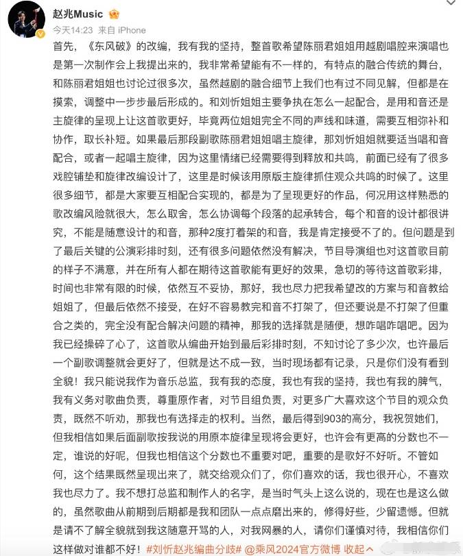 搜狐娱乐讯 6月23日,《乘风2024》音乐总监赵兆发文回应与刘忻陈丽君,关于改编《东风破》出现分歧。他表示在和音部分希望保留原曲的主旋律抓住观众共鸣,不能随意设计,然而问题到了公演彩排依然没有解决,好不容易教完和音不打架了,但还要说重合之类的,“那我的选择就是随便,想咋唱咋唱吧。”
