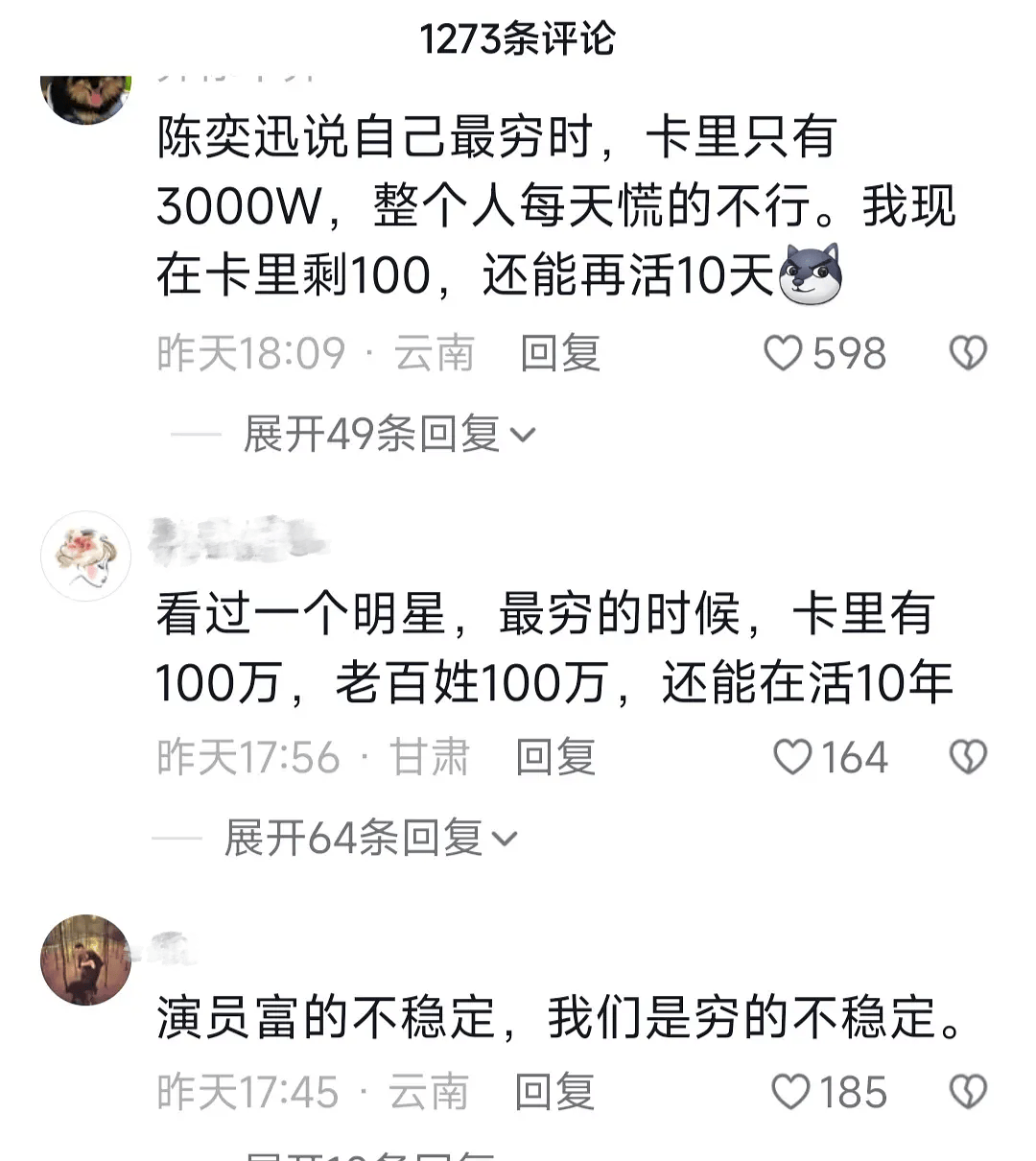 从网友们的评论不难看出,大家很难对张晨光的这番言论产生共鸣,毕竟他的收入跟大家不成正比,一部戏就赚了普通人一辈子都赚不到的钱,都这样了还说自己穷到养不活自己并且只能吃泡面啥的,确实有点让人没办法理解。