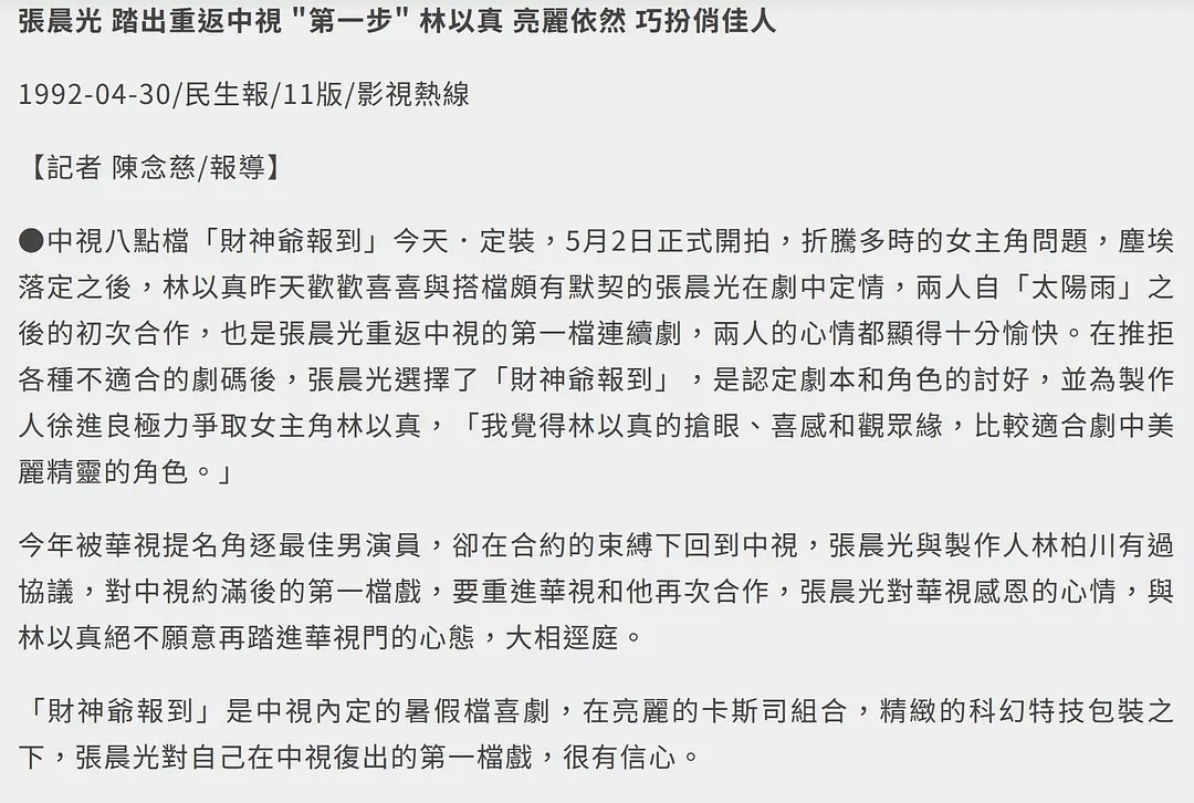 林以真也是中视的演员,但她的咖位远远不如张晨光高,两人合作过几次,媒体在报道时也以张晨光为主,林以真为辅。