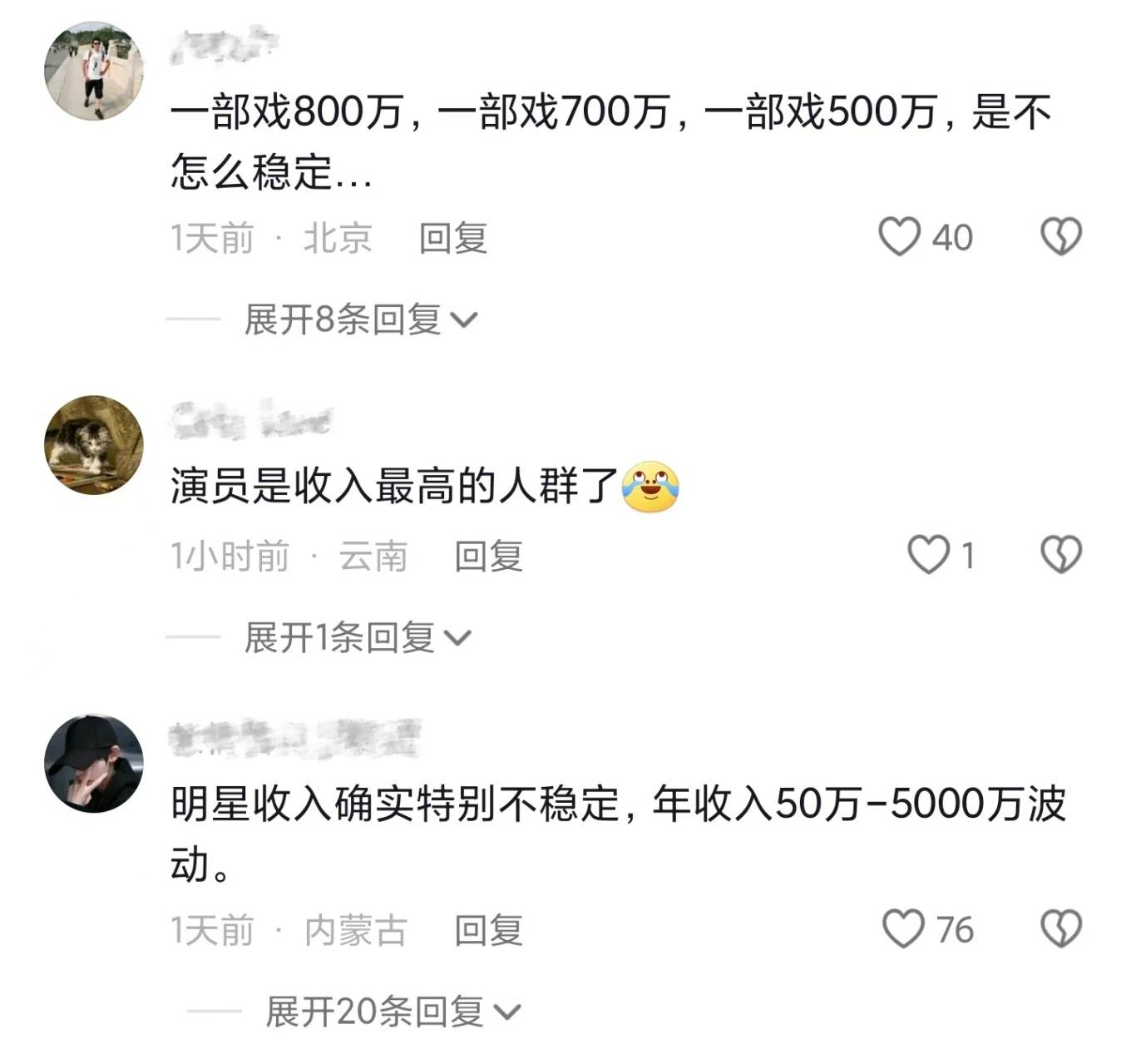 “一部戏800万,一部戏700万,一部戏500万,是不怎么稳定”、“明星收入确实特别不稳定,年收入50万到5000万波动”