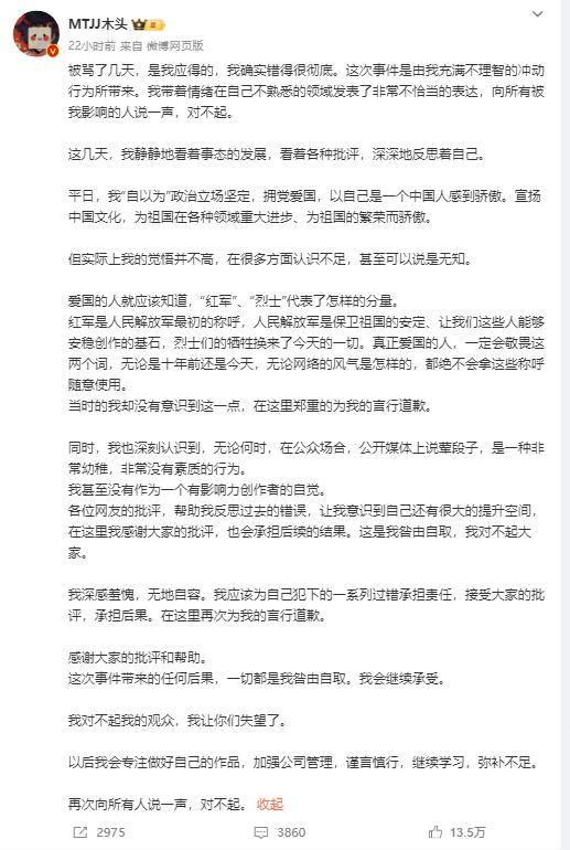 搜狐娱乐讯 6月22日,《罗小黑战记》主创MTJJ罗小黑和孙呱都发文为早期的言行道歉,两人表示,我在这里感谢大家的批评,也承担后续的结果。对不起,我的观众让你们失望了,再一次向所有的人说一声对不起!