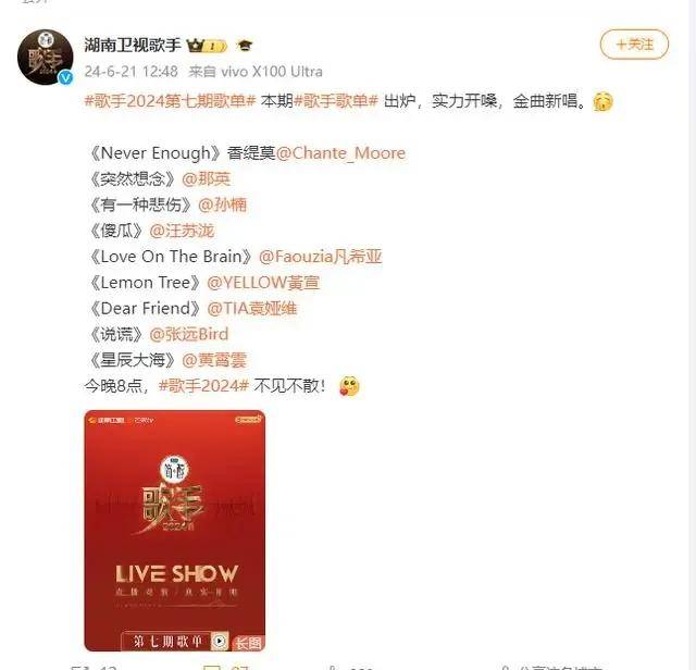 21日中午,歌手官方微博公布歌手2024第七期歌单。