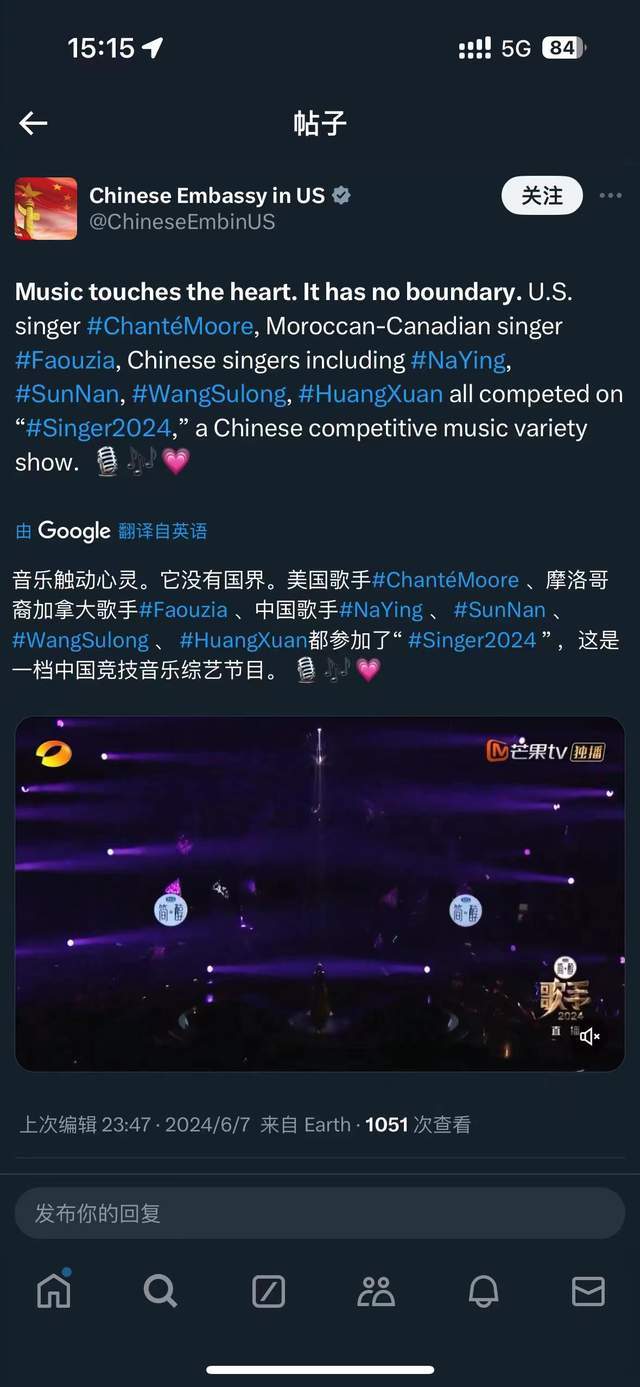 (中国驻美国大使馆在其推特账号推荐《歌手2024》)
