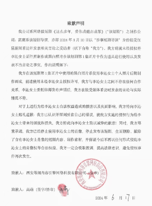 搜狐娱乐讯 近日,网剧《这么多年,爱你成瘾亦成罪》被网友发现,在剧集中使用演员李沁的照片,并将其P成黑白照。随后制作该网剧的公司发声明向李沁致歉,表示已深刻反省错误,将全面删除相关内容,保证今后不再以任何形式侵犯李沁肖像权等合法权益。