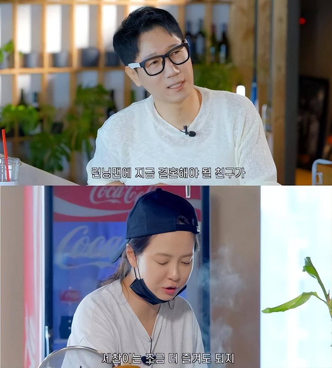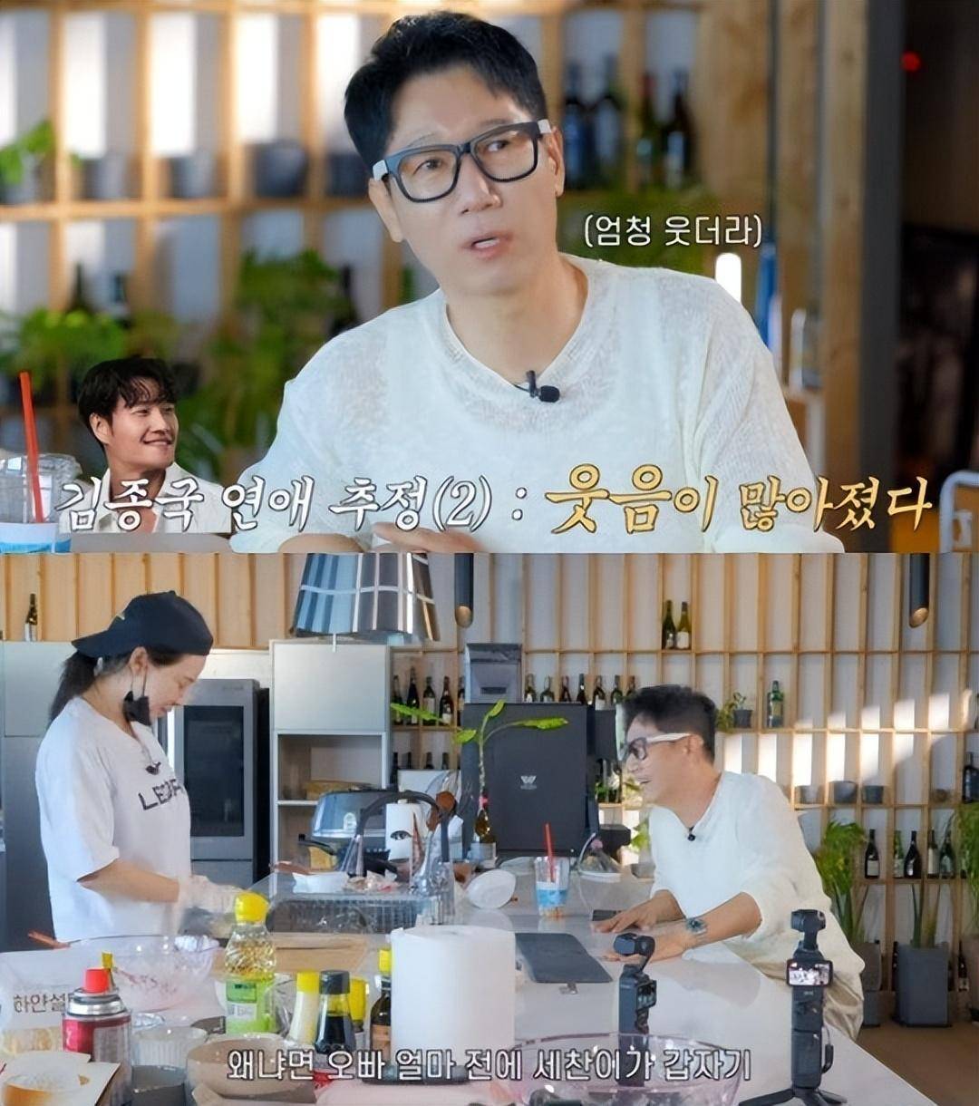 一边做饭一边聊天的池石镇表示,《Running Man》里有一个朋友现在应该结婚了,他指的是宋智孝、金钟国、梁世灿等单身成员。宋智孝表示,钟国比较着急,可以玩得开心。此时,池石镇提问道,“钟国现在没有女朋友吧?”,宋智孝做出了爆炸性的声明,“我认为他有”。