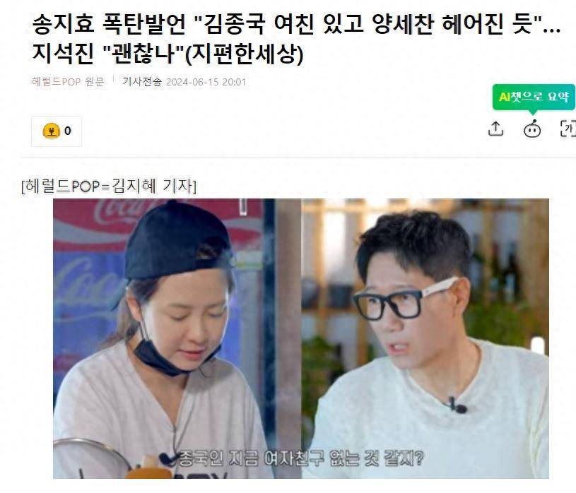 当池石镇问宋智孝,你呢?时,宋智孝说,我现在正在找(男朋友),她接着说,我是那种谈恋爱就会全力以赴的人,所以会很引人注目,我很想只和那个人共度时光,所以我是潜水的类型,引起了韩国网友们的关注。对于,韩国知名女星,宋智孝爆料,金钟国有女朋友,梁世灿好像已经分手,大家怎么看呢?
