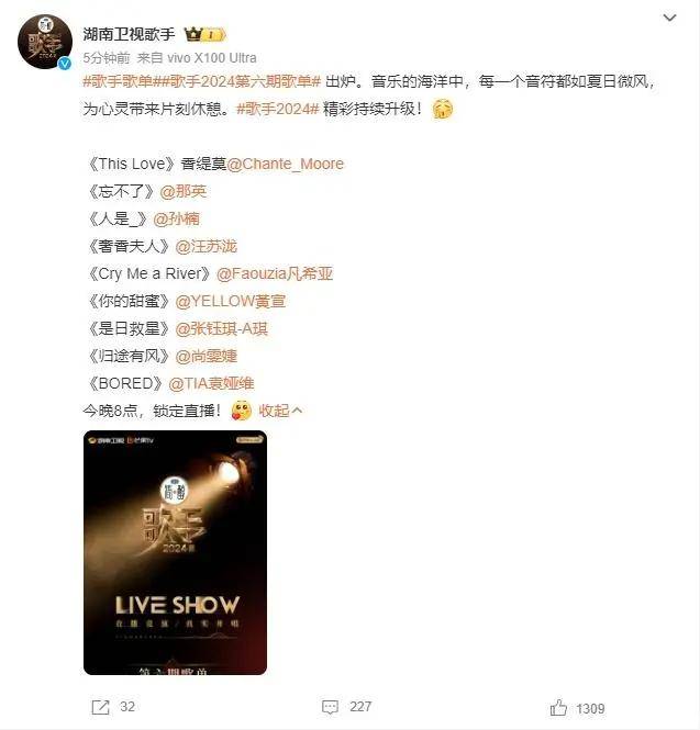 其中那英将演唱童安格的《忘不了》、孙楠将演唱周深的《人是_》、汪苏泷将演唱凤凰传奇的《奢香夫人》、张钰琪将演唱徐佳莹的《是日救星》、尚雯婕将演唱王菲《归途有风》!