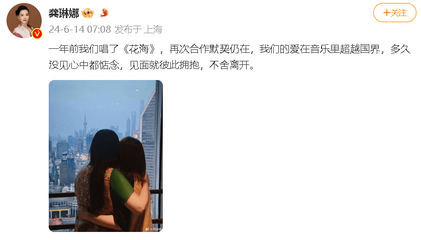 搜狐娱乐讯 6月14日,龚琳娜晒出与美依礼芽拥抱的背影合照,并配文:“一年前我们唱了《花海》,再次合作默契仍在,我们的爱在音乐里超越国界,多久没见心中都惦念,见面就彼此拥抱,不舍离开。 ”