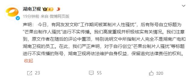 湖南卫视官方发布声明,否认节目制片人性骚扰:“特别说明文中所指制片人完全不是湖南广电和湖南卫视的员工。”湖南卫视表示将将依法维护自身权益,对于进行不实传播的账号保留追究法律责任的权利。