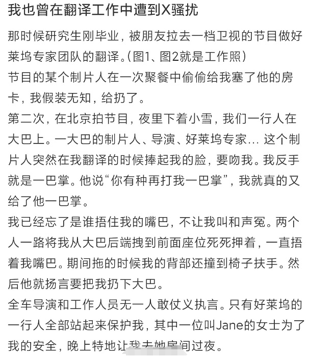 搜狐娱乐讯 近日,有网友爆料自己曾在芒果台某节目工作时被制片人性骚扰,当时很多工作人员都在大巴车上,制片人突然在她翻译的时候捧起她的脸,要吻她,这名网友反手打了一巴掌,但之后又被捂嘴不让大叫和声冤,全车工作人员无一人敢仗义执言,只有一位Jane女士为了她的安全,晚上特地叫她去自己房间过夜。同时,这位网友还晒出了一张工作照。据悉,该节目湖南卫视推出的建构式喜剧真人秀节目。