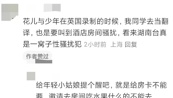 另外,还有其他网友爆料称《花少》在英国录制期间,自己的同学去当翻译,但在酒店房间也遭到骚扰。