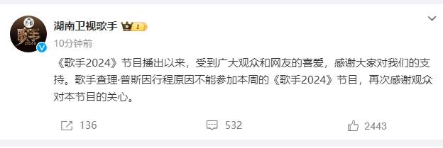 搜狐娱乐讯 6月12日,《歌手》官方发文,正式确认“断眉”查理·普斯因为行程原因,无法参加本周的节目并进行表演。据悉,此前有网传尚雯婕和袁娅维将空降本周的比赛,以代替“断眉”。