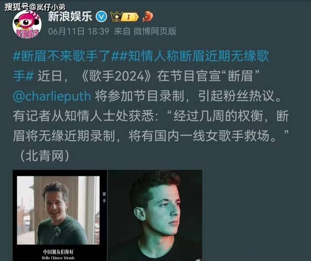 《歌手2024》第六期节目还有两天的时间就要跟观众见面了,而作为本期最大看点袭榜歌手断眉查理普斯已经确定缺席录制,据知情人士爆料消息属实,其实最初在昨天只是各种爆料的传闻,如今来看并非空穴来风。