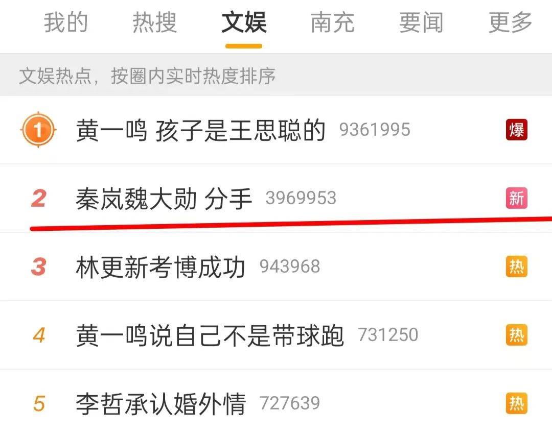 消息一出,立即引发网友热议,不少人猜测他说的是魏大勋和秦岚,很快,一则秦岚魏大勋疑似分手的词条,冲到了热搜前排。