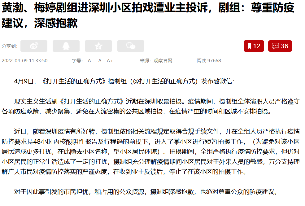 而剧组之后发布了道歉信解释了自己的行为,表示他们只在下午短暂的拍了半天时间,并没有做过分的行为。