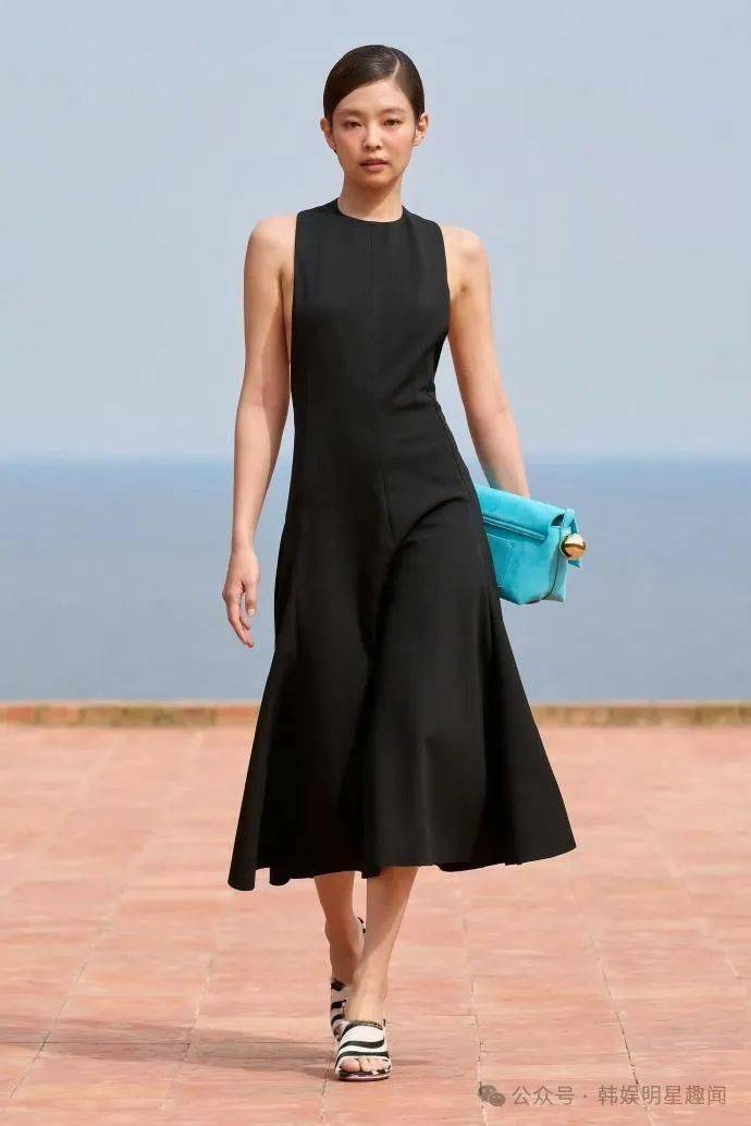 因为Jennie不是以嘉宾的身份出席的,而是作为模特首次亮相T台!在 JACQUEMUS 秀场结束时,Jennie 身着漂亮的黑色挂脖连衣裙走下 T 台,优雅的套装彰显了时尚的潮流,她的头发盘起来,搭配亮蓝色包包和其他配饰,网友们都难以掩饰自己的震惊。
