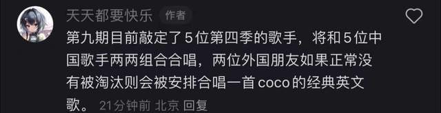 其实,按照正常的播出顺序来看,到了第九期的时候,还会再有一位重量级的袭榜歌手助阵,但节目组将第三位袭榜歌手取消了,反而改成了邀请当初参与录制《歌手》第四季的五位歌手回归,并且与新一季的首发歌手两两进行合唱的全新模式,同时,凡西亚和香提莫如果到时候还没有淘汰的话,也将合唱一首李玟的歌曲。