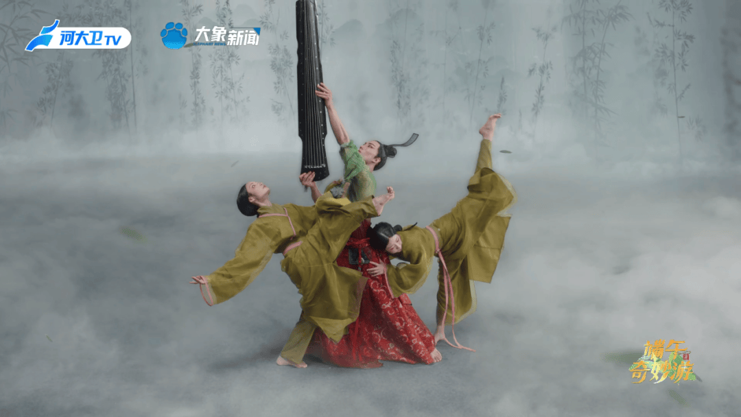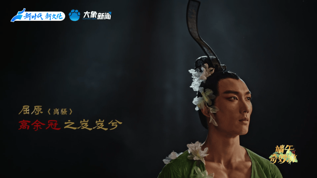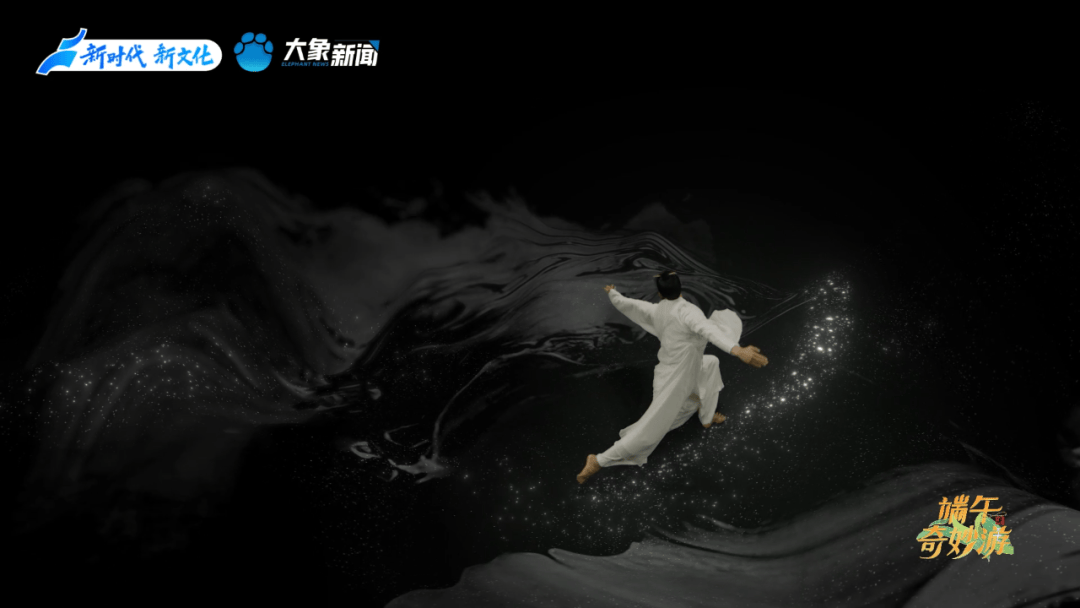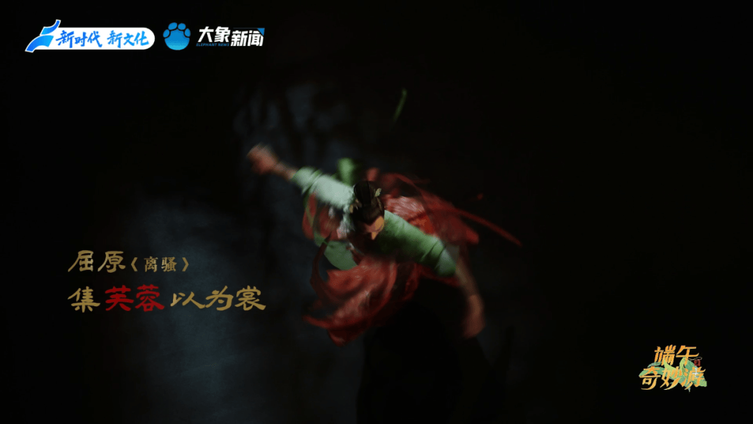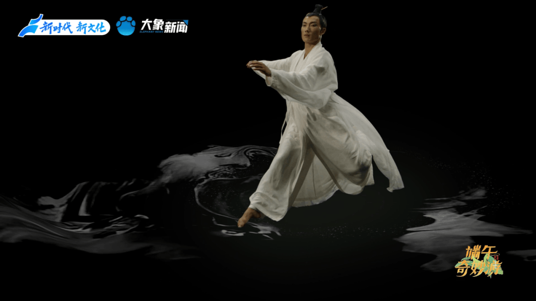 开篇舞蹈《屈子问天》,取自著名舞蹈艺术家杨丽萍担任总导演、著名音乐家谭盾亲任音乐总监的舞台剧《荆楚映象》。节目里,青年舞蹈家大朱饰演的“屈原”,身披《离骚》描写的“芰荷”“芙蓉”,在翩翩飞舞的蝴蝶群中托起古琴。琴韵悠长,屈原高洁的理想与现实的残酷在舞蹈中碰撞,他热烈的情感迸发着愤恨的胸臆。白与黑的交织,清与浊的经纬,如同他在世俗与自我间的纠结与挣挫。