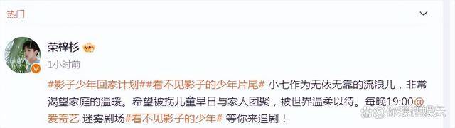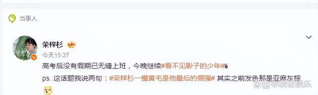 荣梓杉在发文中写道:“高考后没有假期已无缝上班,今晚继续《看不见影子的少年》。”