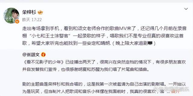 原来,荣梓杉在发文中写道:“走出考场拿到手机,看到和颂文老师合作的歌曲MV来了,还记得几个月前在录音棚小七和王士涂警官一起录歌的样子,唱歌我们不是专业但真的很喜欢这首歌,希望大家听完也能找到一些安定和晴朗。”