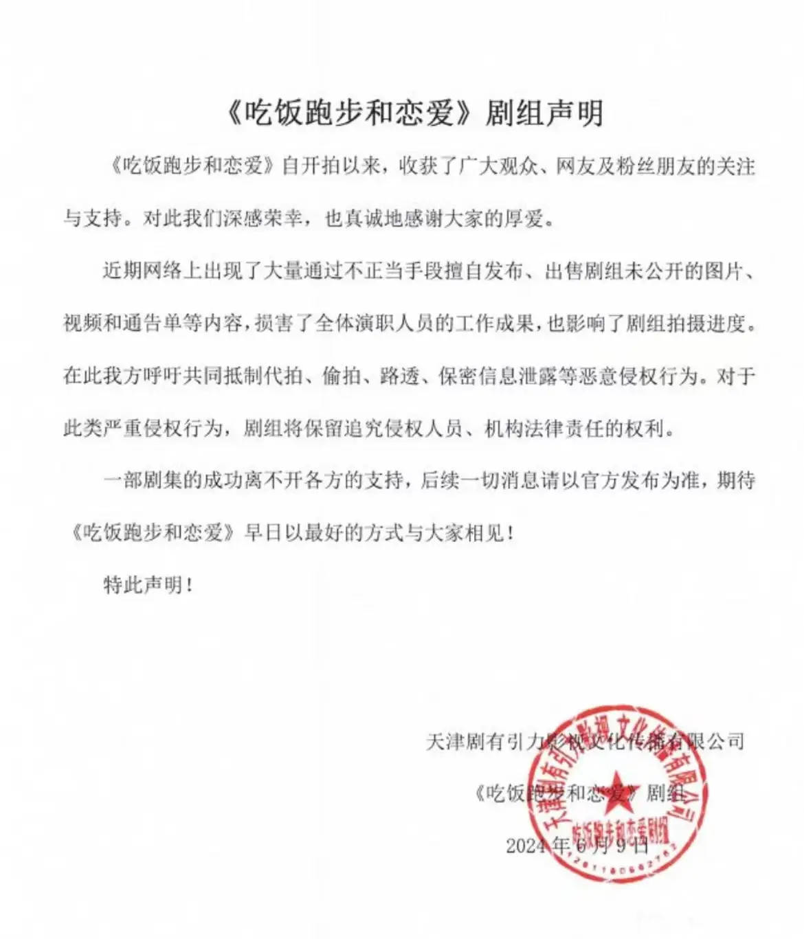 一部剧集的成功离不开各方的支持,后续一切消息请以官方发布为准,期待《吃饭跑步和恋爱》早日以最好的方式与大家相见!