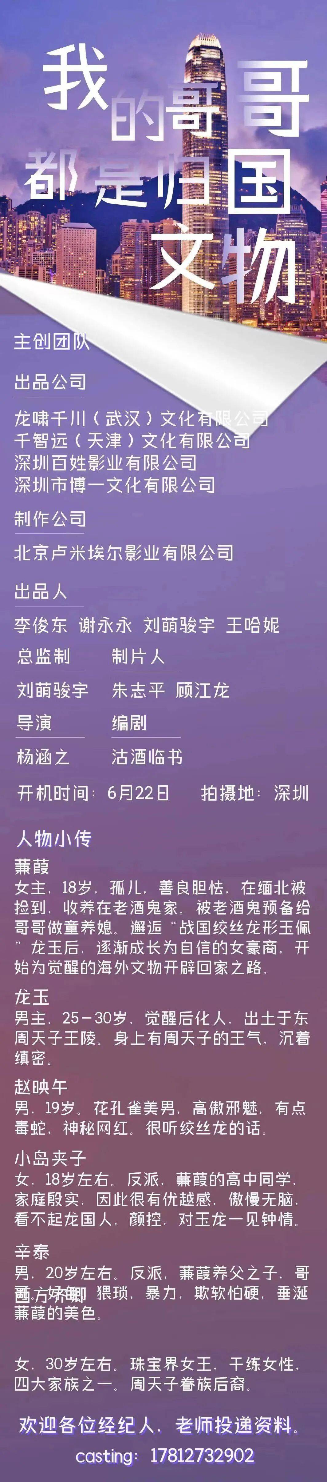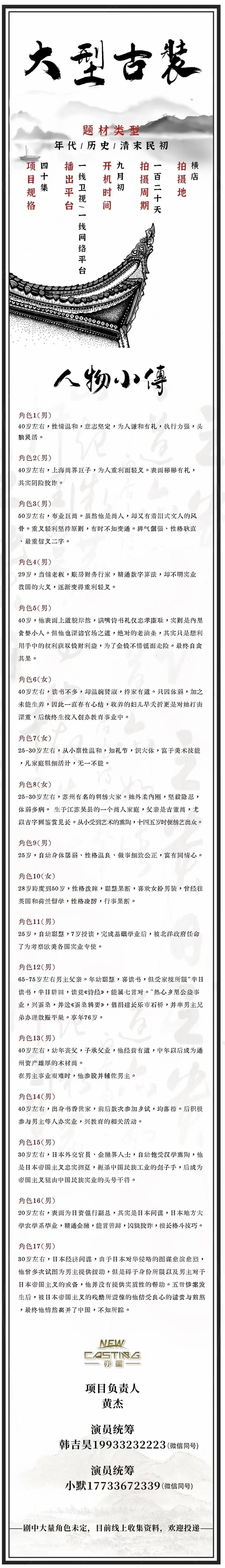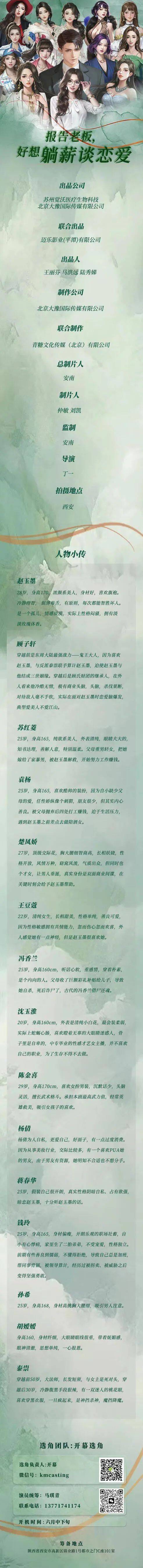 剧中大量角色未定,欢迎各大经纪公司及演员朋友投递资料与我们联络,期待与您合作。