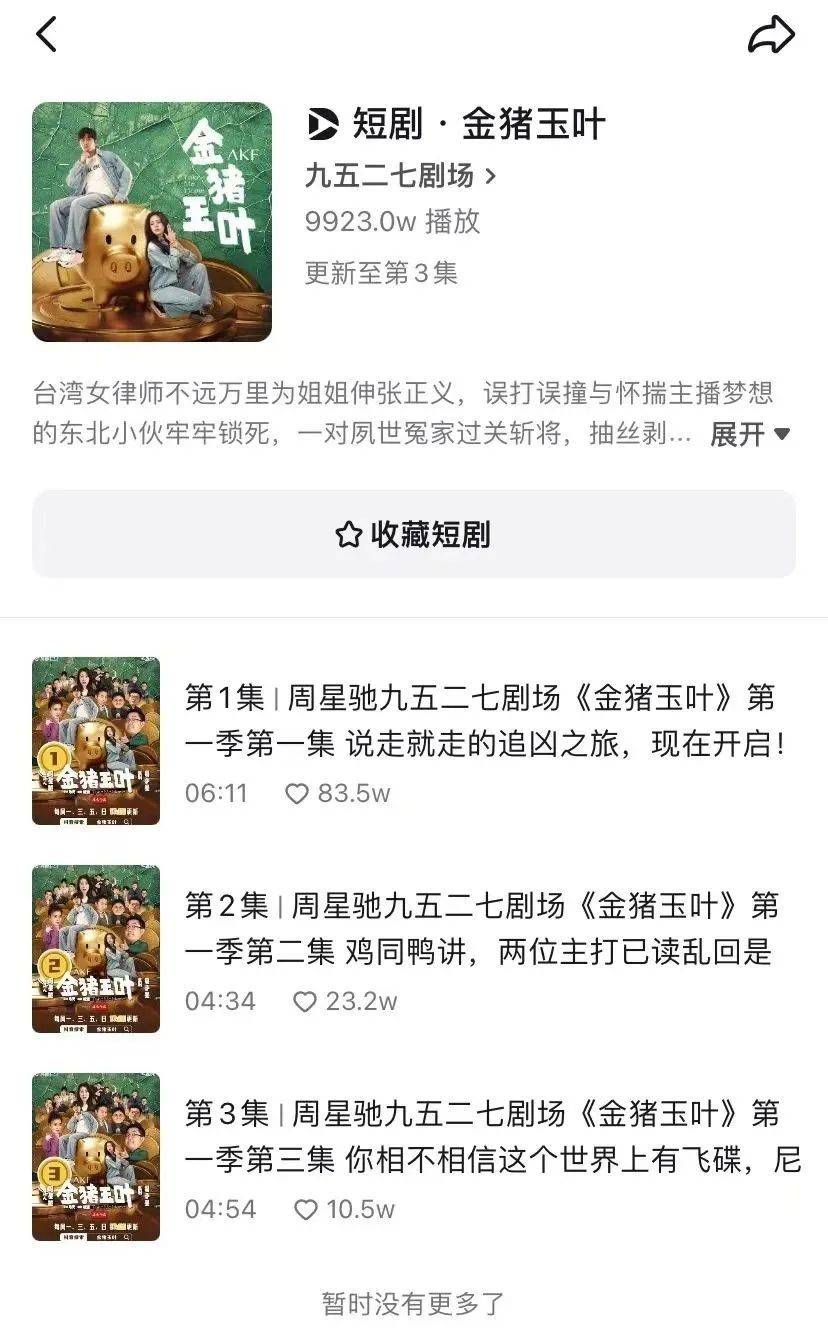 近日,“周星驰首部短剧” 《金猪玉叶》终于在抖音的“九五二七剧场”上线,该剧由周星驰出品、易小星监制、马史执导,吸引了不少关注。