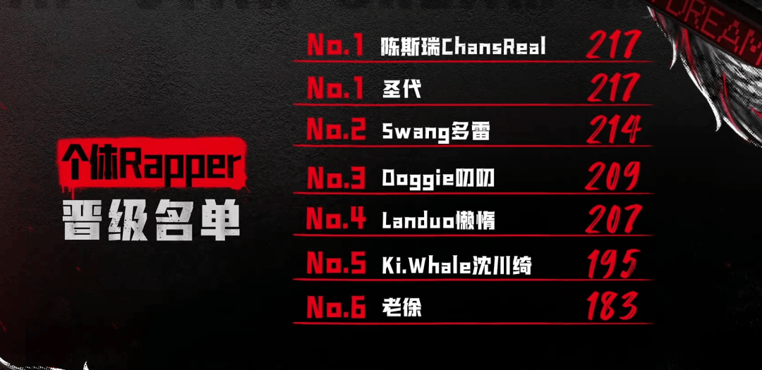 Doggie这嗓子玩Rage真的太爽了,前半段炸后半段又耍起flow,把全场都唱嗨了,最终也是209票高票轻松晋级。