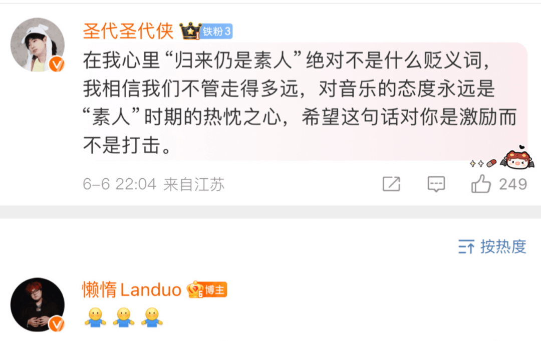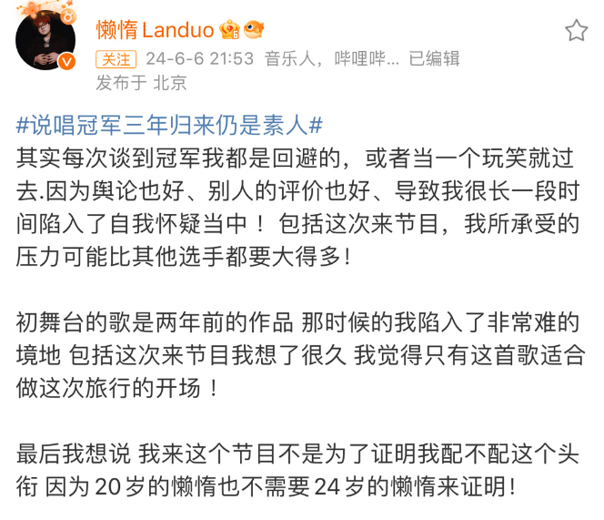 而这次初舞台,其实是懒惰两年前的歌,但懒惰觉得这首歌适合这次旅行的开场。同时,懒惰也发文回应了自己“拿完冠军仍是素人”。