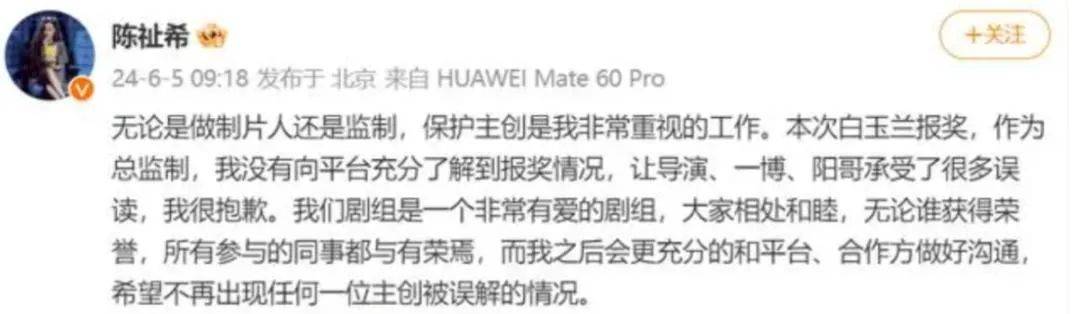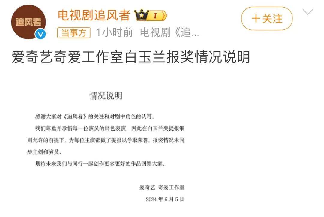 而在昨日上午,作为《追风者》出品方也是负责报送白玉兰评奖的爱奇艺工作室发布情况说明,表示在“白玉兰奖”提报细则允许的前提下,“为每位主演都做了提报以争取荣誉,报奖情况未同步主创和演员”。